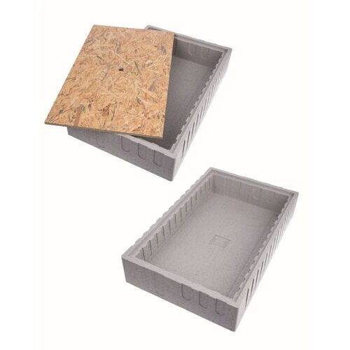 Sockelkasten, hellgrau, rundum geschlossen, mit Abdeckung aus wasserfester OSB-Holzplatte